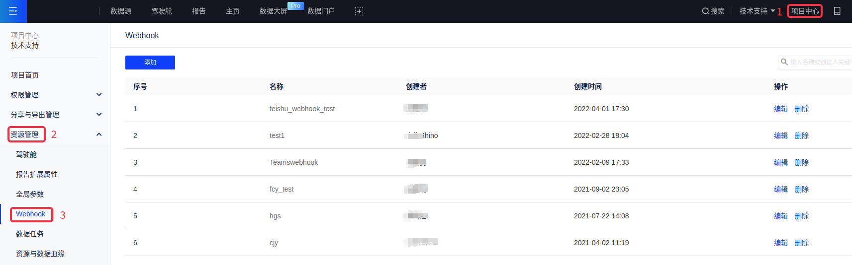 在【项目中心】-【资源管理】-【Webhook】,如果您具备管理员权限,则可以管理该项目下所有Webhook,增加、删除和编辑对应的Webhook。