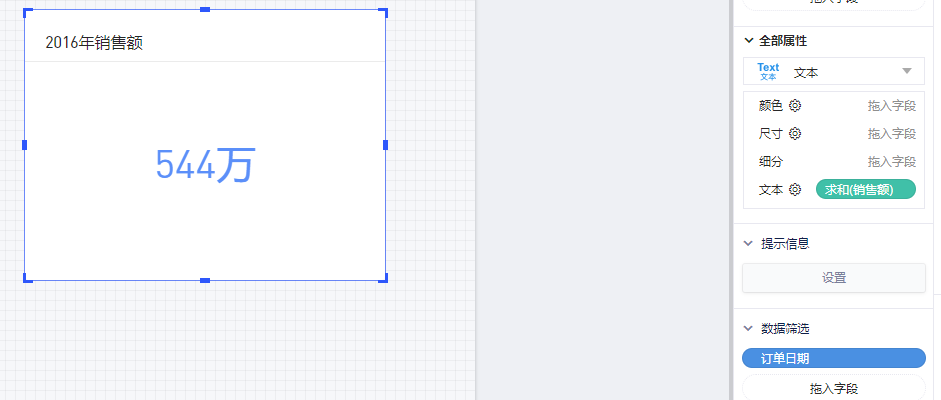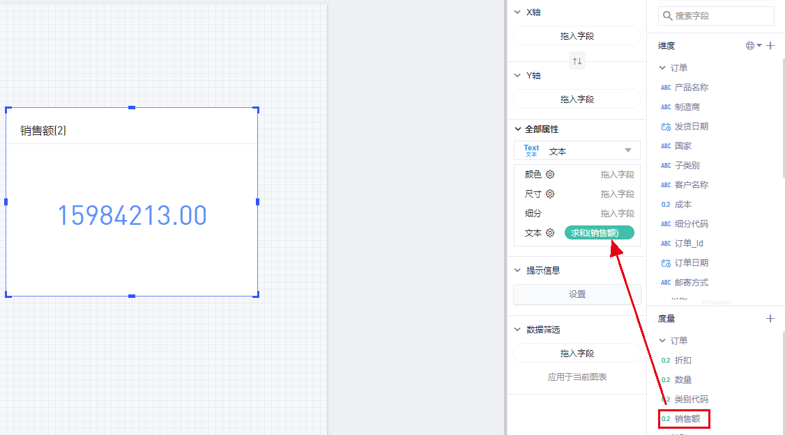 以默认数据模型为例,需要展示销售额情况,涉及到1个字段:度量“销售额”。