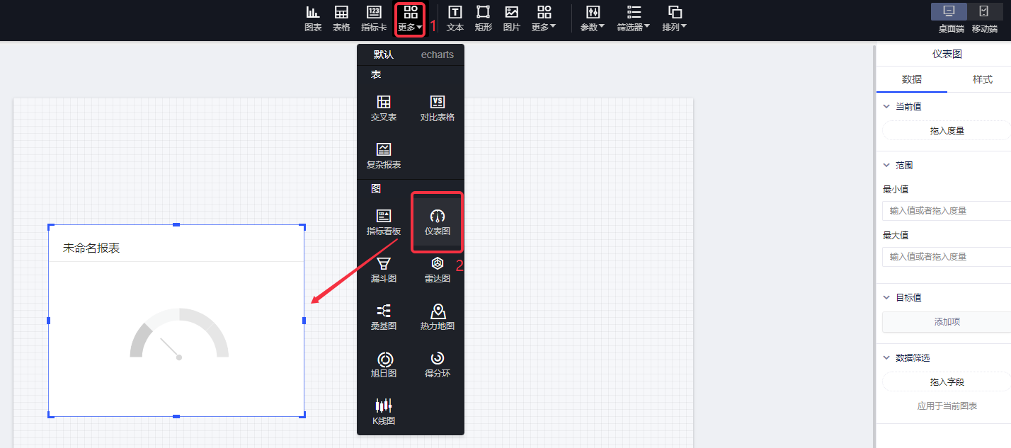 (3)为了让仪表图表达的含义更丰富,需要给仪表图定一个范围,用户可以更直观的查看当前值与最大值之间的差距,这个范围即可以是固定的,即手动输入一个范围;也可以是动态变化的,即拖入两个度量字段,如图: