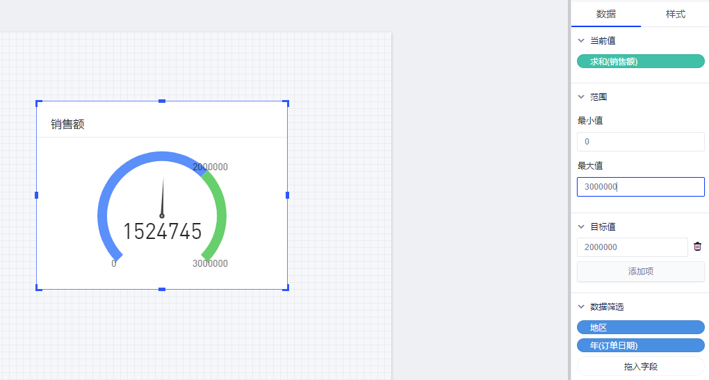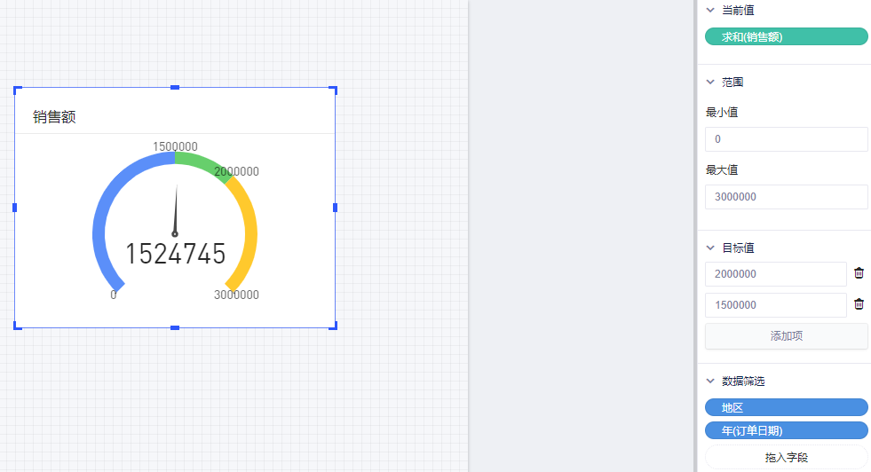 仪表图由仪表盘面和指针组成,指针需选择1个度量,例如销售额、利润率等,仪表盘面支持设置起始值以及目标值,便于用户获取参照信息。