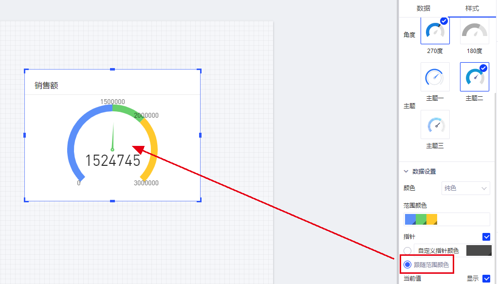 (2)在有指针的情况下,用户可以自定义指针的颜色,如果选择跟随范围颜色,指针颜色会和范围颜色保持一致,如图: