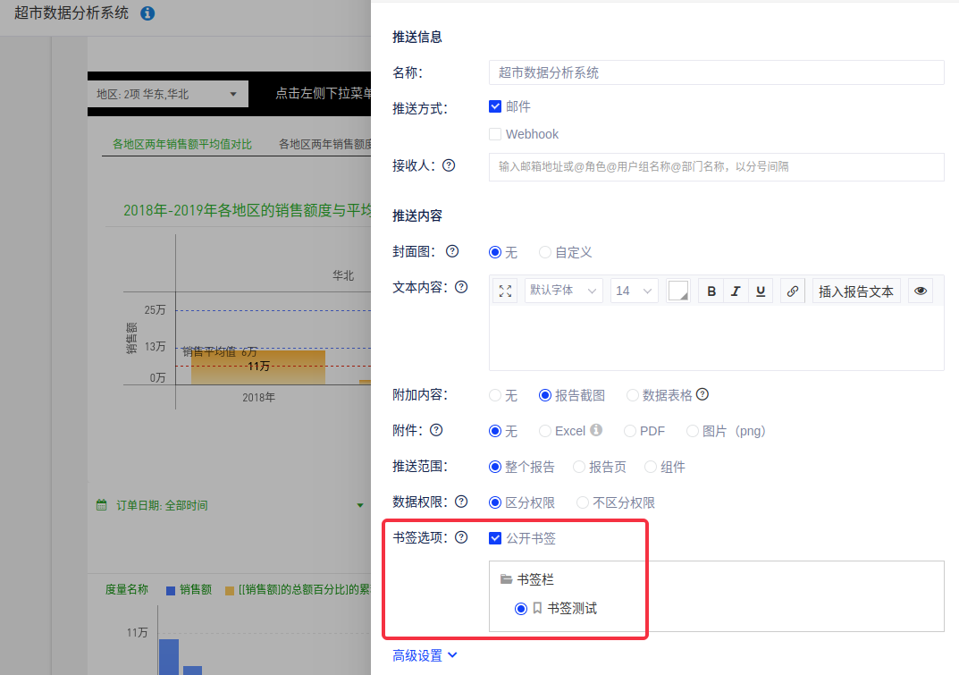(1)在浏览报告时,有的报告提供了筛选器、参数等控件,报告的读者可通过选择筛选器的选项浏览自己关心的数据,例如2018年华东西北地区销售额、2019年东北华北地区销售额,可以将当前报告的状态保存成一个书签,推送时可以选择书签,推送自己关心的数据;