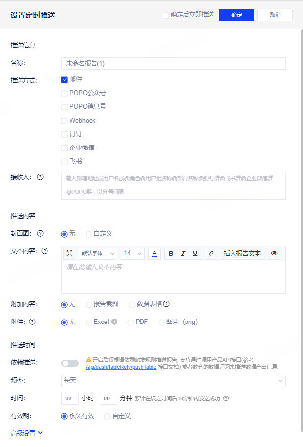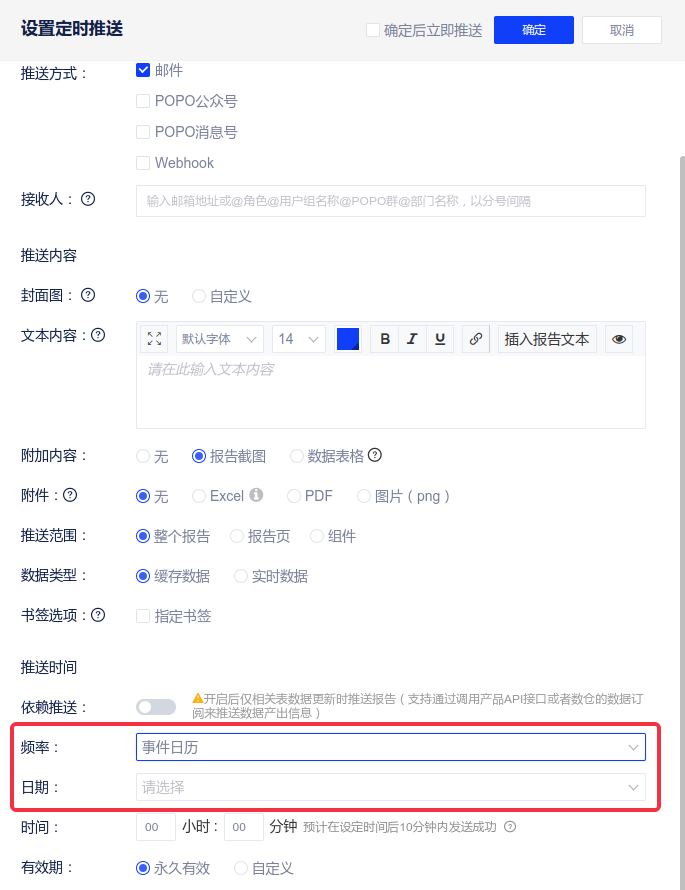 您可以在报告定时推送设置中设置推送有效期,默认为永久有效,选择自定义后,支持配置【开始日】与【到期日】,选框内默认选择为当天~一个月。