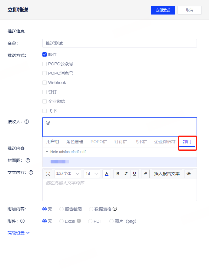 (3)邮件推送范围拆分为正文和附件,可分别推送不同范围的内容。在推送界面的高级设置里面,增加“附件推送范围选项”。