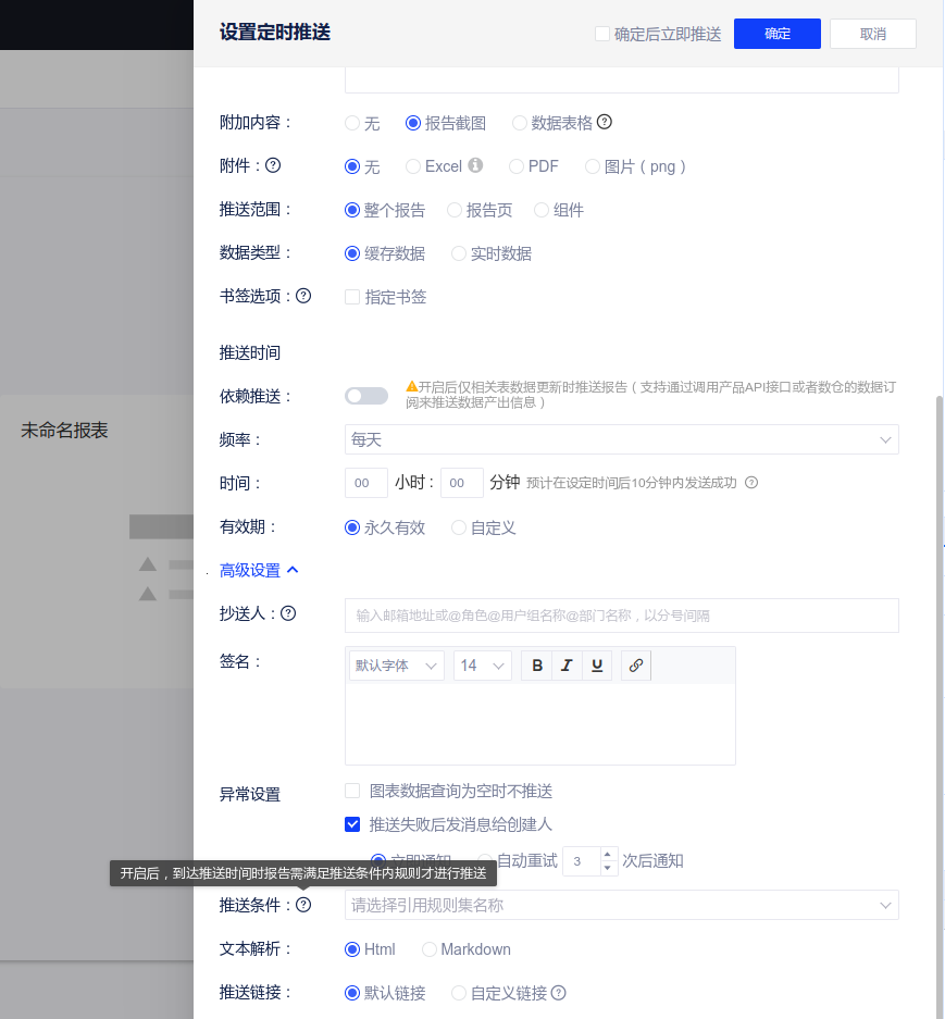 报告 - 设置定时推送 - 高级设置 - 新增【推送条件】,下拉列表内展示智能决策规则集管理中的规则集名称;
