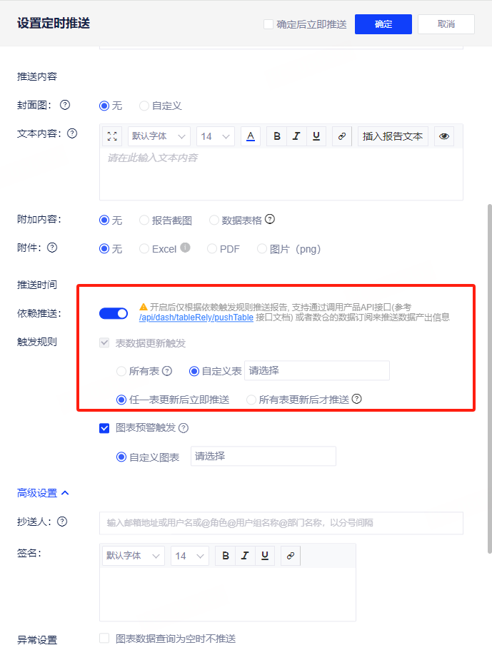 表数据更新触发:可选择触发的表范围(所有表或自定义表范围),基于选择的表范围可再选择任一表更新后立即推送或所有表更新后才推送,所有表不包括Excel和csv类型数据源。