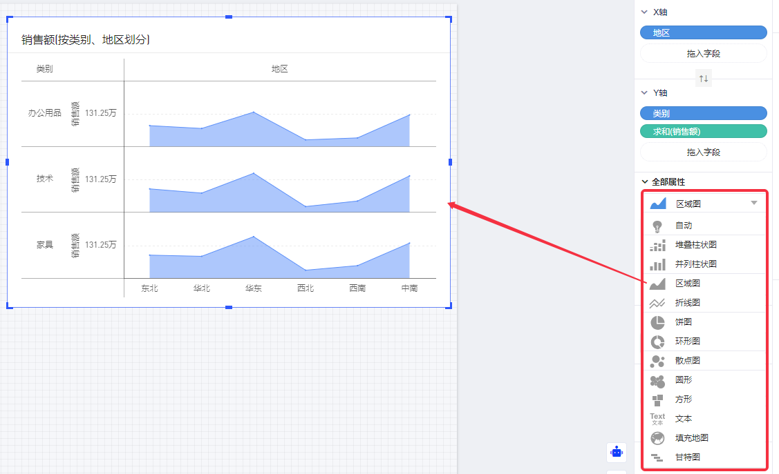 以默认数据模型为例,查看各地区、各产品类别的销售额情况,将涉及到3个字段: 维度“地区”、“产品类别”,度量“销售额”。