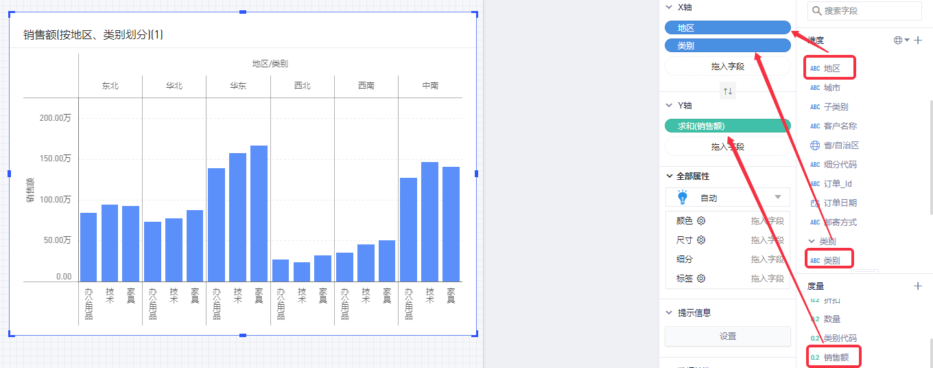 以默认数据模型为例,查看各地区、各产品类别的销售额情况,将涉及到3个字段: 维度“地区”、“类别”,度量“销售额”。