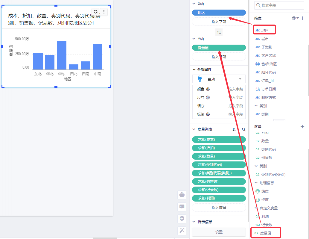 (2)将“地区”字段拖入X轴,“度量值”字段拖入Y轴;