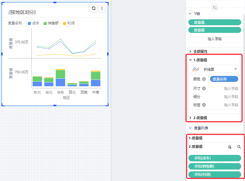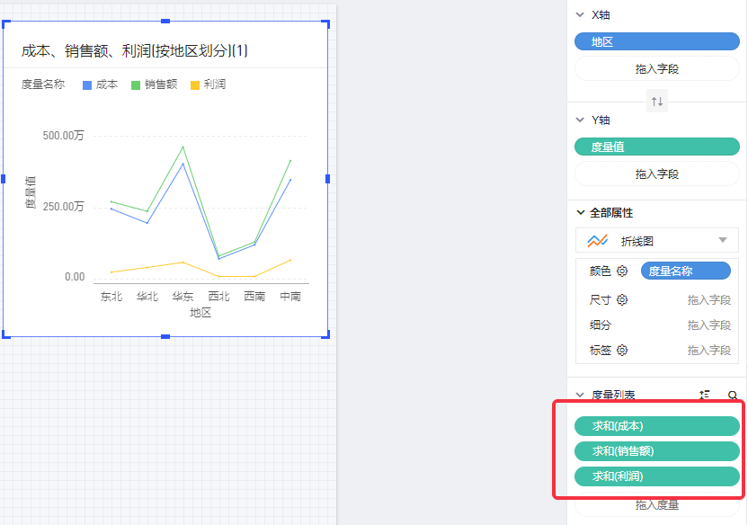 (4)在度量列表中移除不需要的度量,这里我们只保留“销售额”、“成本”、“利润”,即完成了多度量图的绘制。