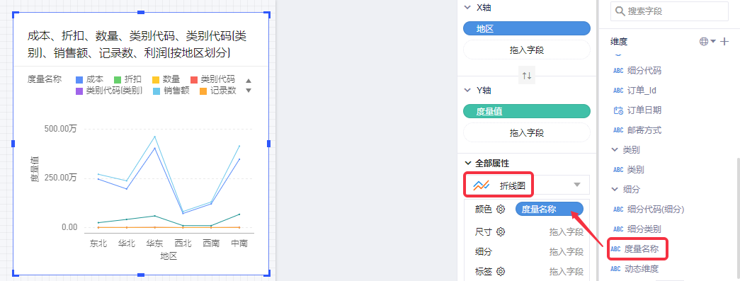 (3)将“度量名称”字段拖入属性面板的“颜色”项,图表类型设置为“折线图”;