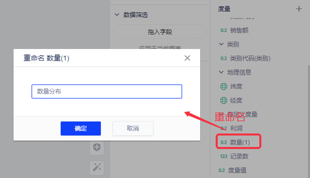 (2)找到度量列表中的刚复制的“数量1”字段,将重命名为“数量分布”;