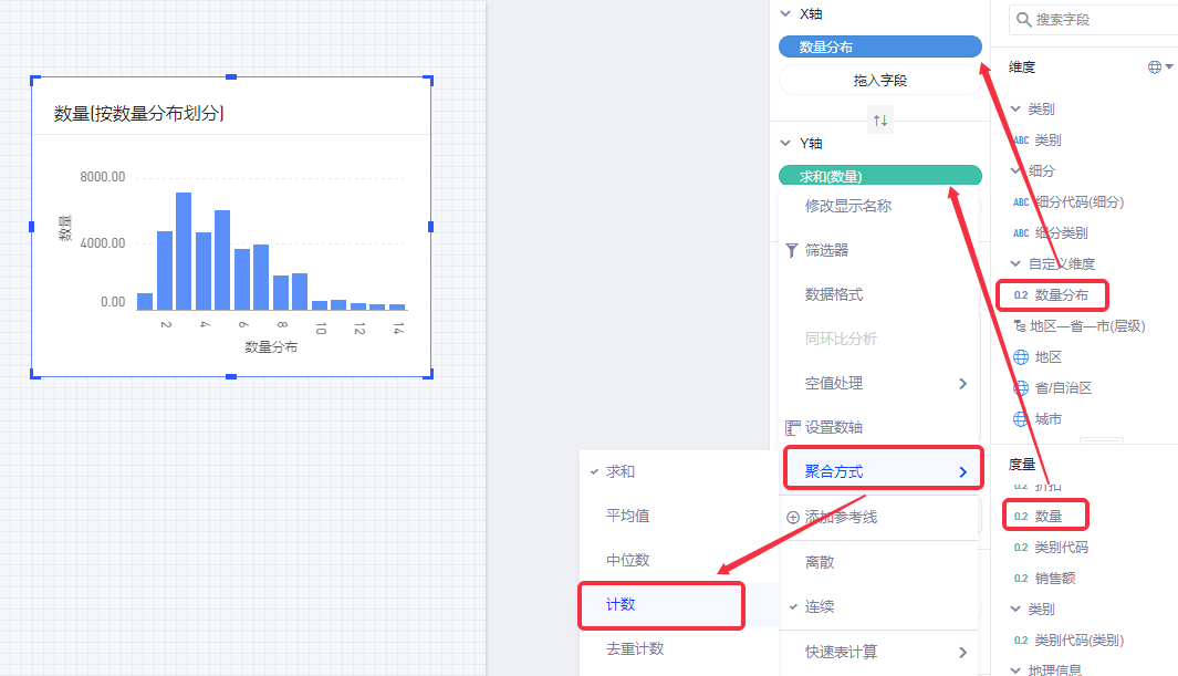 (6)更改度量的聚合状态,鼠标Hover在度量“数量”上,点击下拉菜单(也可右键呼出),选择下拉菜单中的“聚合方式”中的“计数”;