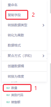 (1)选择度量列表中的“数量”字段,鼠标Hover上去,点击下拉菜单(也可右键呼出),选择下拉菜单中的“复制字段”;