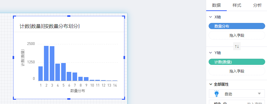 (5)在图表的数据面板的操作:将维度“数量分布”放置在X轴,度量“数量”放置在Y轴;