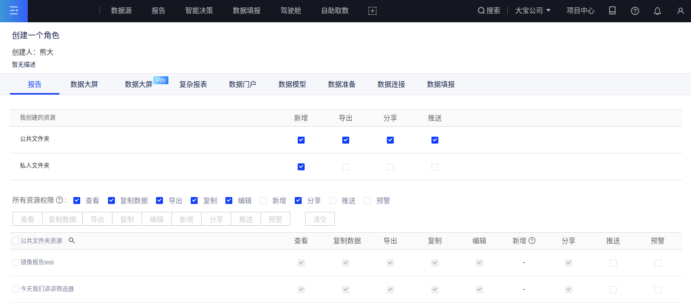 本产品中的资源包括:报告、数据大屏、数据大屏PRO、复杂报表、数据门户、数据模型、数据准备、数据连接、数据填报的公共文件夹和私人文件夹。