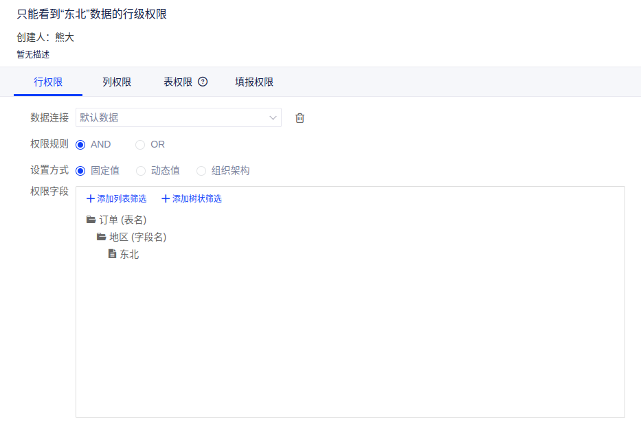 使用上述方法时,当我们存在多少个大区,就需要创建对应数量的“数据行级权限”。当组织人员规模达到一定程度后,管理复杂度往往呈几何增长,这样的设置方式必然需要大量的时间成本和人力成本来维护。同时考虑到组织内不同人员所能拥有的数据权限往往与TA所在的部门、岗位或地区有一定的映射关系,那么能否提供一种简便的设置路径,能够直接对不同部门的用户匹配不同的行级权限呢?