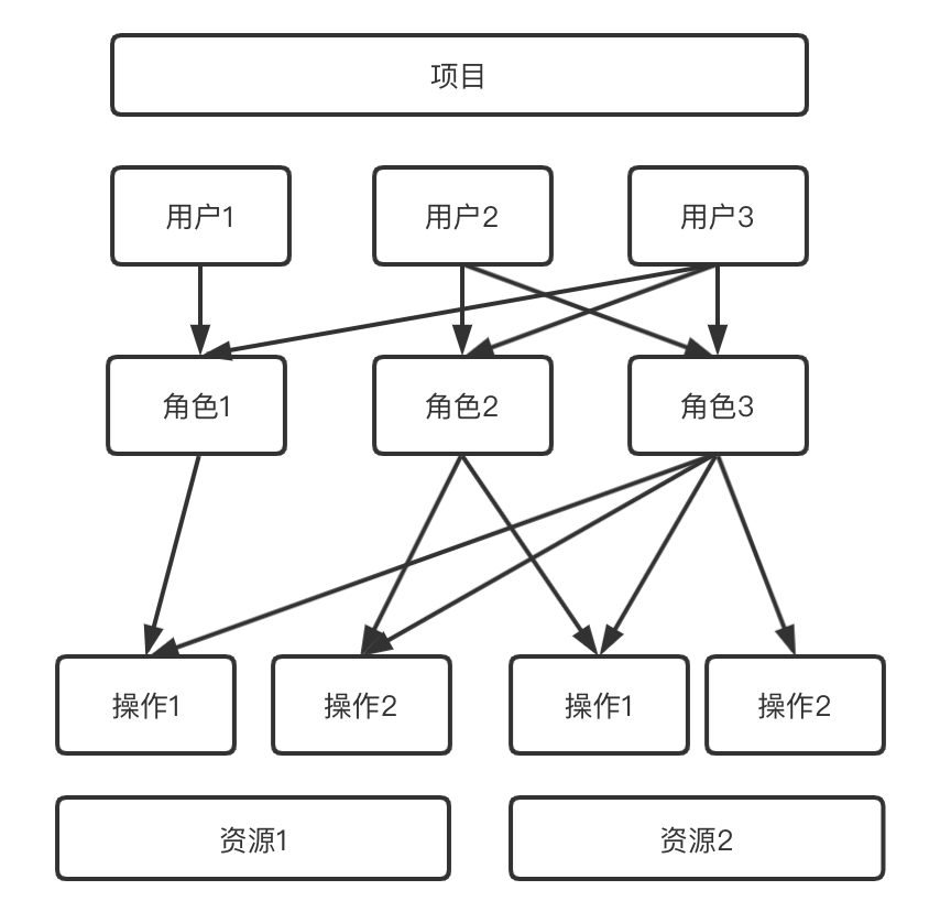 角色与权限绑定,即项目中用户的权限与其被赋予的角色相关。一个用户可以拥有多个角色,一个角色也可以被添加给多个用户,每个角色可以被赋予多个权限。以下图为例,用户1只拥有角色1的权限,即对资源1进行操作1;而由于用户3拥有3个角色全部的权限,因此该用户可以对资源1和资源2分别进行操作1和操作2。