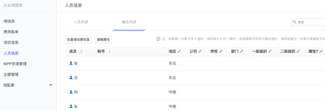 (1)首先在[企业域管理]-[人员信息]-[属性列表],设置一个属性值“地区”,在对应用户后输入东北或其他地区;
