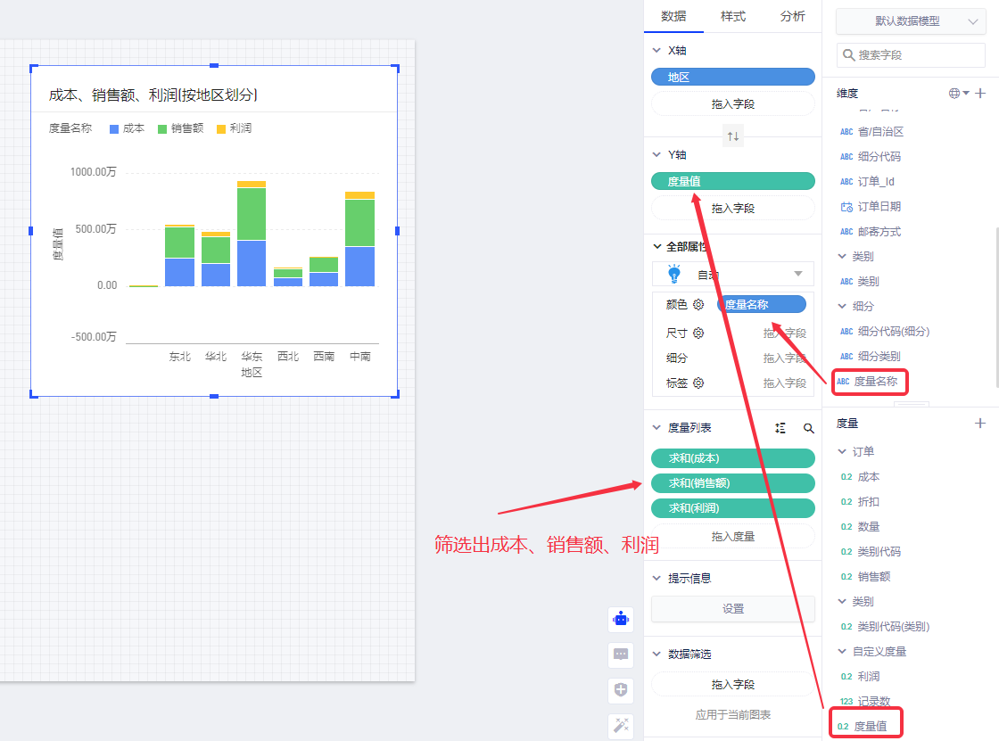 以默认数据模型为例,查看“每个地区的销售额”柱状图,将涉及到2个字段:维度“地区”,度量“销售额”。