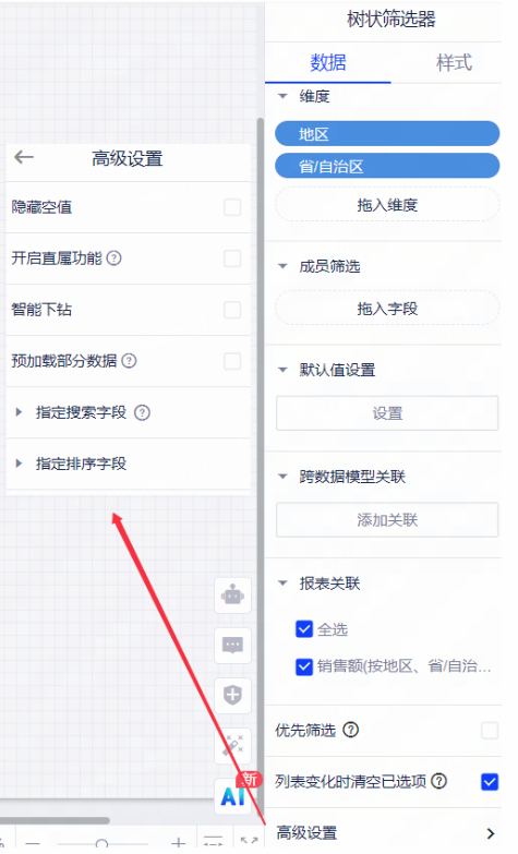 在树状筛选器的数据面板下方,点击“高级设置”按钮可进行隐藏空值、开启直属功能、智能下钻、预加载部分数据、仅允许维表关联字段拖入、指定搜索字段和指定排序字段设置。