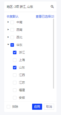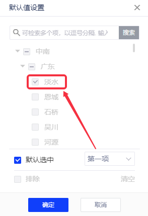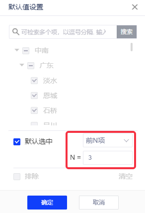 [前N项]:树状筛选器全部展开后最小子节点的前N项(例如:地区-省份-城市,地区下第一项是中南、地区第一项为广东、城市,默认选中前三项为最小子节点中南广东省淡水市、恩城、石桥,如下图演示)。