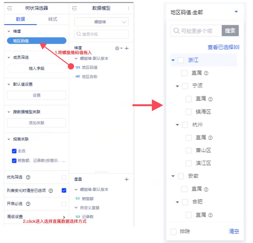 (2)在树状筛选器的数据面板的操作,将维度字段“地区”、“省份”拖入维度。默认会关联当前页面的同一数据模型的所有报表;