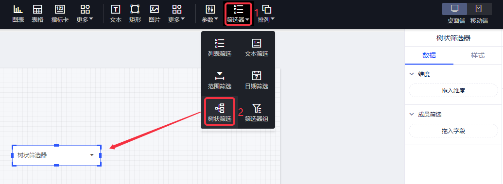 (1)在报告编辑页面,选择“树状筛选”控件,在画布上添加一个“树状筛选器”;