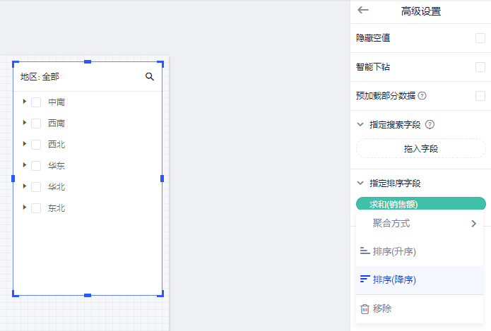 指定排序字段:例如将字段销售额拖入(系统会对其进行聚合),然后设置降序排序,则意味着销售额高的地区-省份-城市排在前。
