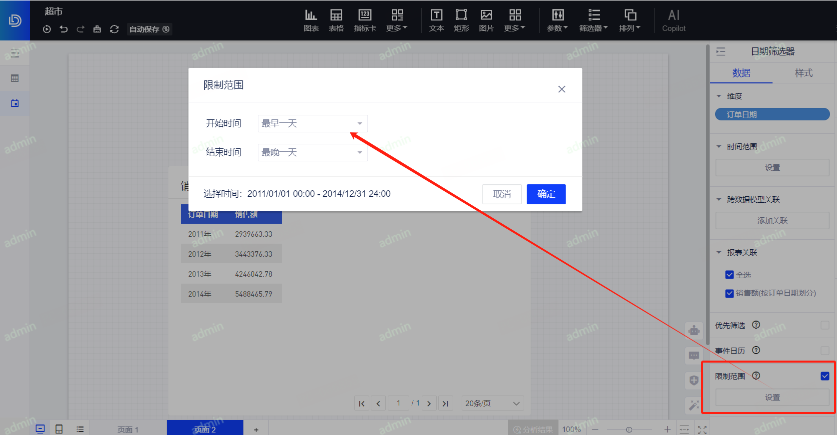 日期筛选器在编辑状态下编辑,可以在编辑状态、预览状态或者阅览状态重新设置时间范围,但只有编辑状态的时间范围会保存。