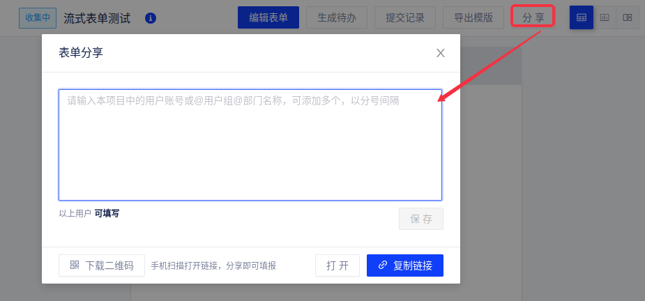 - 表单链接:将表单链接或二维码分享给成员后,成员点击链接或扫码即可填报