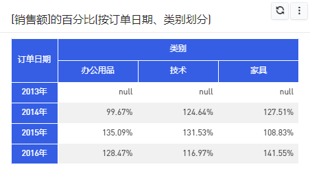 - 我们根据产品类别划分了三个小组分别作百分比计算,在每个分组中沿着年(订单日期)中的2013-2016按顺序计算与前一项的比值。