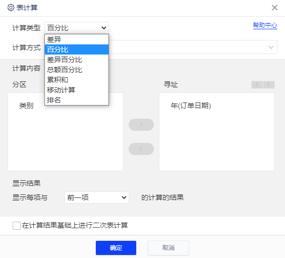 百分比是表计算的一种类型,计算同一个度量值在不同维度项上的比值(以百分比呈现)。支持以选定区域第一个/最后一个或计算单位前一个或后一个为基准作差值计算,支持横向或纵向对比计算。