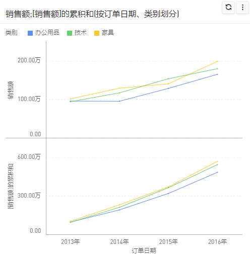 - 根据产品类别划分了三个小组分别作累积和计算,在每个分组中沿着年(订单日期)中的2013-2016年按顺序计算与其前面所有值的和。