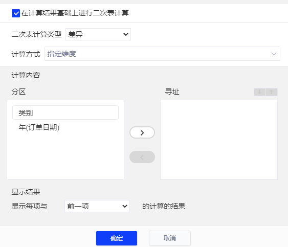 (3)计算内容是决定当前视图中,哪些维度用来分区计算,哪些用来在区分好的组里面按照顺序做计算的,如上图中配置,我们可以得到以下图表中显示的计算结果。