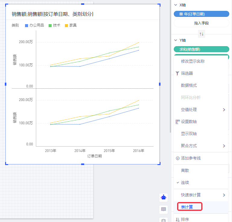 (1)首先把要计算的“销售额”拖拽到配置面板上,并点击小三角(或右键)呼出菜单找到表计算菜单选项;