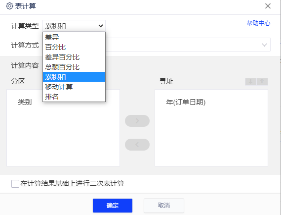 (4)您可以继续在这个累积和上做表计算,只需要在配置面板中最下面的复选框中打上勾,并在下面的二次表计算类型中做进一步的计算。