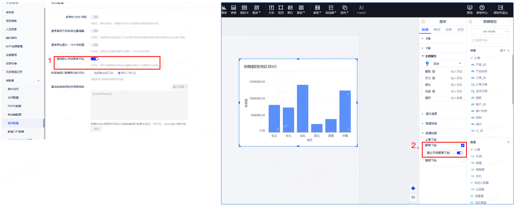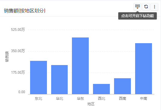 聚集下钻,可以实现用户点击图,下钻到另外一个字段,比如地区下钻到产品类别,出来的是这个地区下面的产品类别的分布数据。