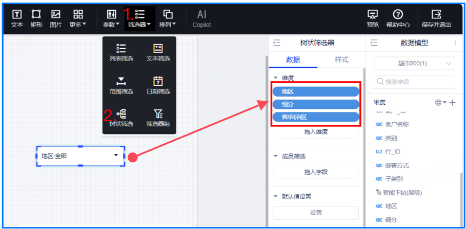 (3)创建树状筛选器,将“地区”,“细分”,“省/自治区”拖入到维度中;