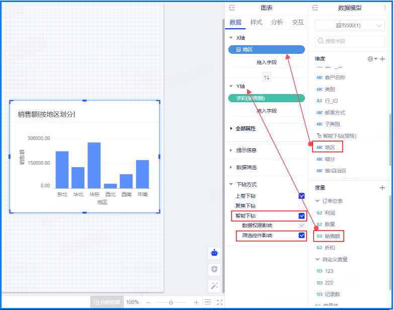 (2)创建一个新的图表,图表的X轴放入带层级的维度“地区”,Y轴放入度量“销售额”,下钻方式:勾选“智能下钻”,勾选“筛选控件影响”;