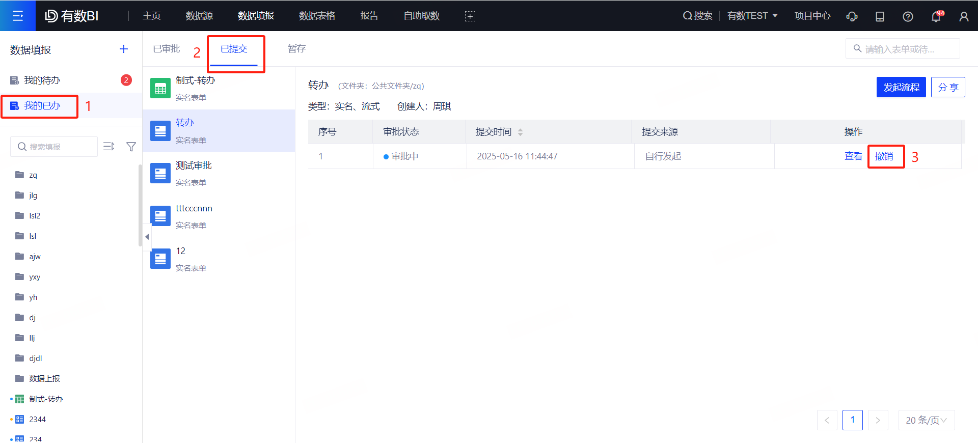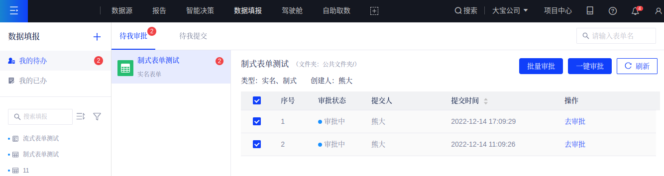 填报者提交的数据需要通过审批者审批后方可写入最终的数据库。在数据填报模块,依次点击【我的待办】-【待我审批】后,可以看到需要自己进行审批的表单列表,可对未审批的数据进行审批操作。