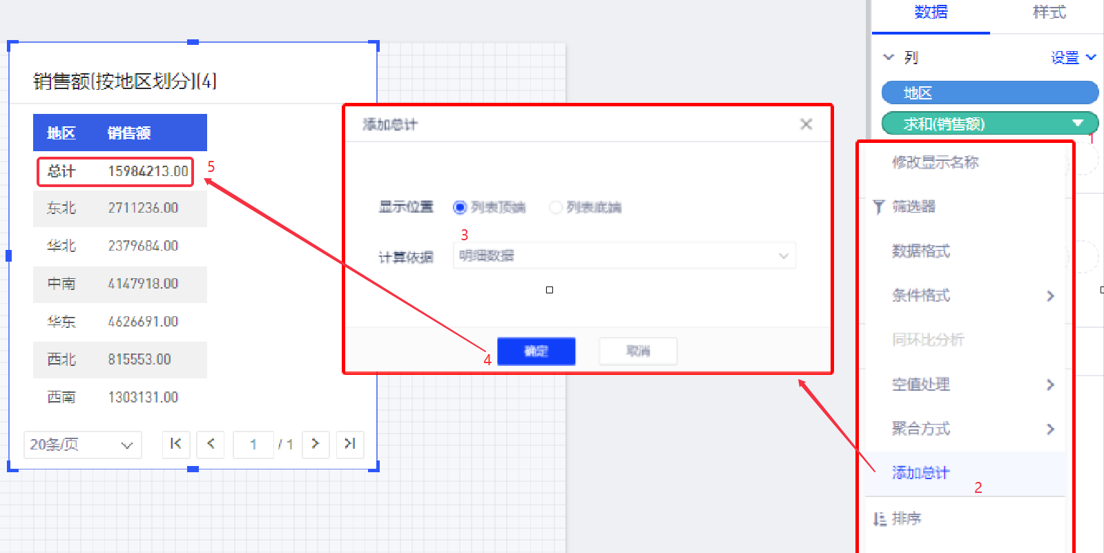 (1)鼠标移动到列面板中的“销售额”,Hover点击下拉菜单,选择“总计”,然后选择总计选项中的“列表顶端”;