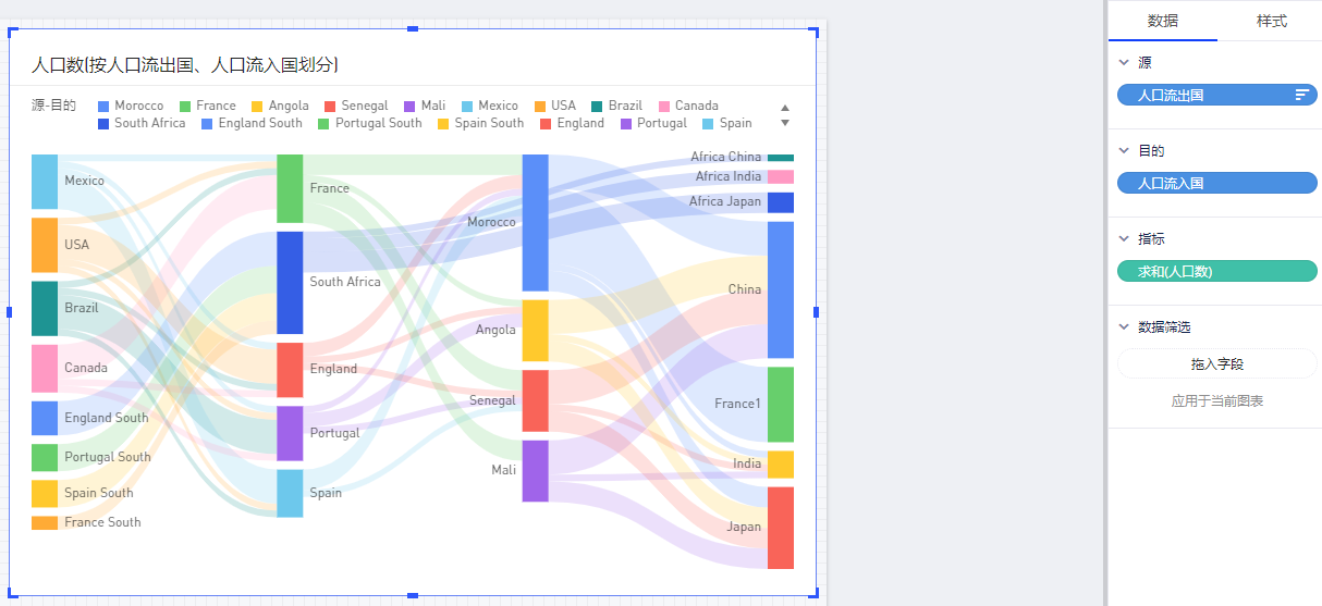 (2)将维度“人口流出国”拖入源,“人口流入国”拖入目的,将度量“人口数”拖入指标,即得到一张初步的桑基图;
