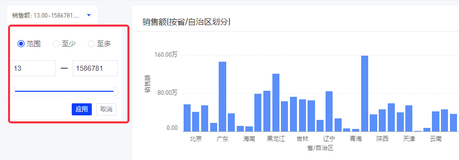 - 例子:下图的销售额范围筛选器关联了两个表格,范围筛选器会获取两个表格聚合后的销售额最大值和最小值,并取两个表格销售额的并集获得最终的最大值和最小值。