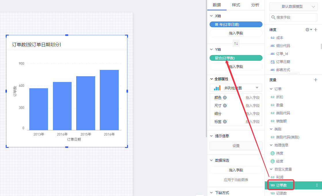 | SUM | 求和聚合,返回表达式中所有值的总计。SUM 只能用于数字字段。会忽略 Null 值。 | SUM(表达式) | SUM([销售额]) |