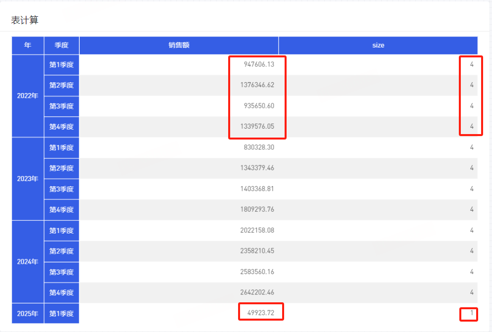 返回分区中的行数。例如,下面的视图显示每季度销售额。在2022年分区中有4行,因此2022年分区的 Size() 为 4。