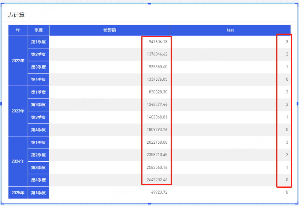 返回从当前行到分区中最后一行的行数。例如,下表显示每季度销售额。在年区中计算 LAST() 时,最后一行与第二行之间的偏移为 2。