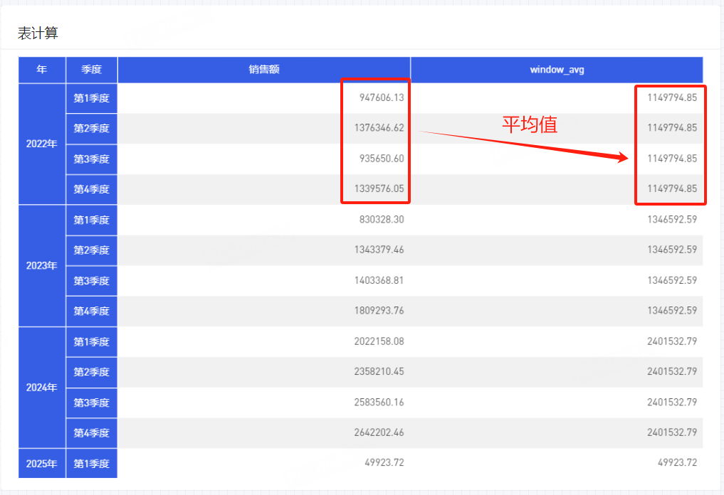 例如,下面的视图显示每季度销售额。以年分区中的窗口计算整个分区下所有季度的平均销售额。