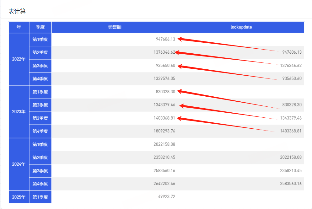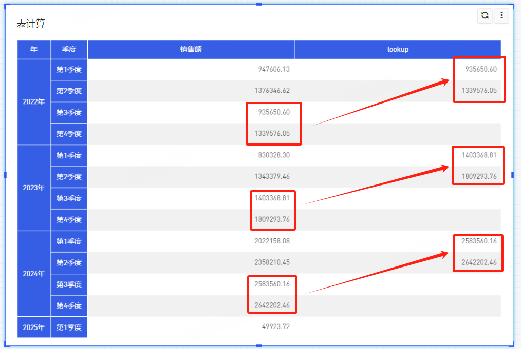 下面的视图显示每季度销售额。当在年分区中计算 LOOKUP(SUM(销售额), 2)时,每行都会显示接下来 2 个季度的销售额值。