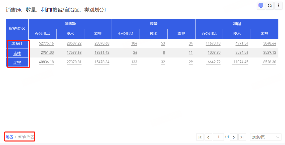 以默认数据模型为例,查看各地区的产品销售额、利润、数量,将涉及到4个字段:维度“类别”、“地区”,度量“销售额”、“利润”、“数量”。